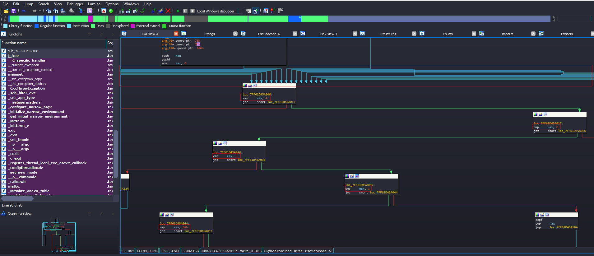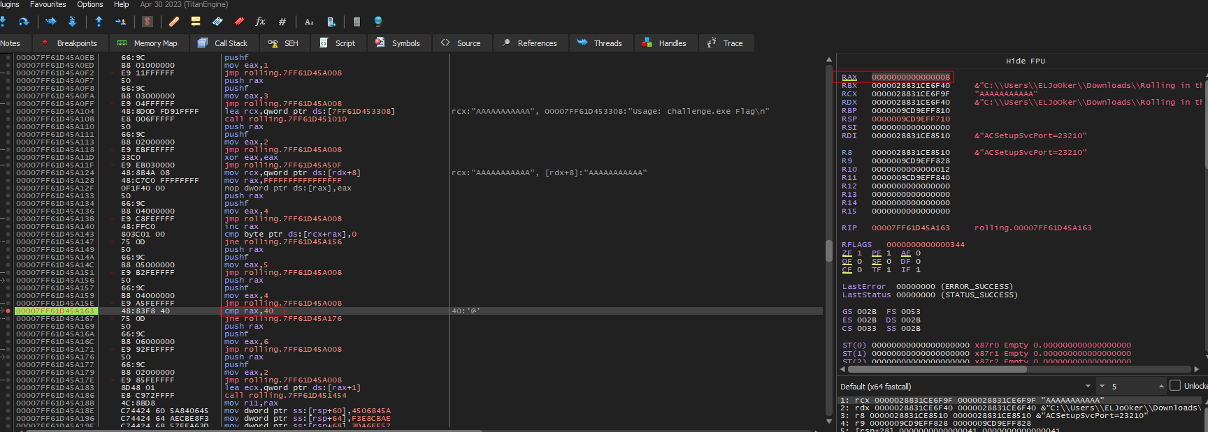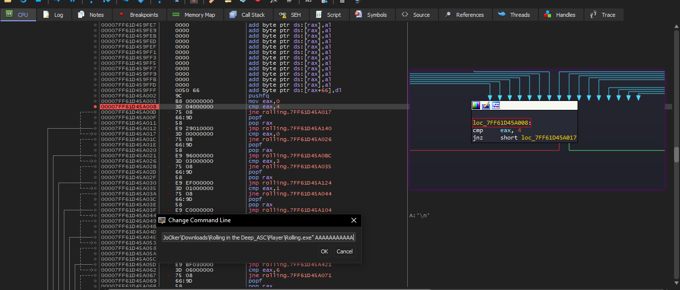 The program shows a lot of loops and paths being controlled by the value of eax Looking on all of that looked time consuming so I to debug for better understanding I used x64 debugger