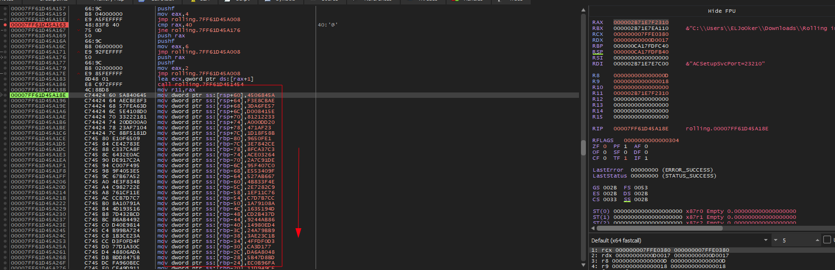 after passing this condition, and after some stepping, I end up with these instruction when it initialize the stack with some values