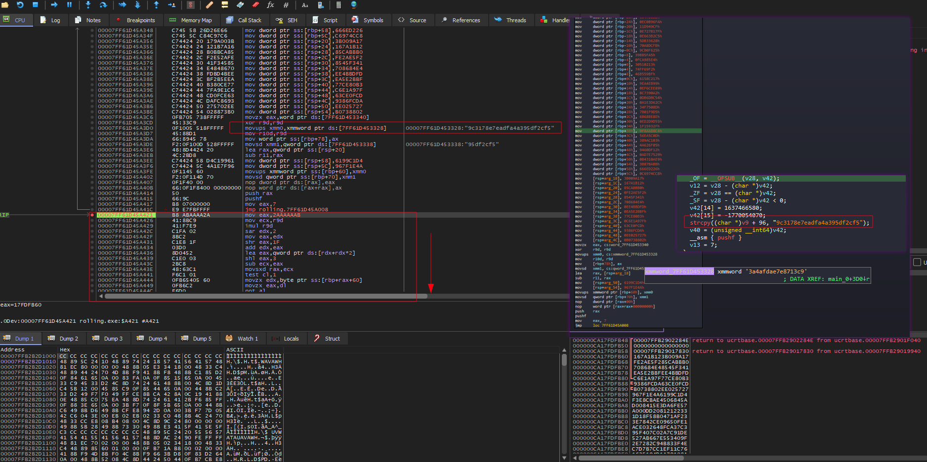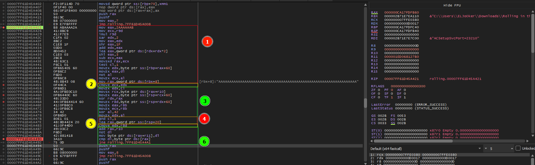 4. Another instruction will change the ZeroFlag and cl,1 ( we will need it because we have another cmove instruction in the block 5 ) Then rax will hold a pointer to another block of hex values lea rax,qword ptr ss:[rsp+20]