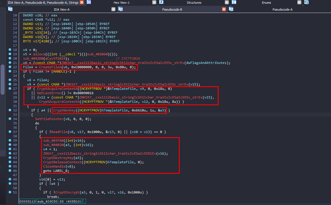(CryptAcquireContextA). - Either generate a cryptographic key or use an existing one