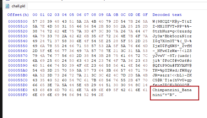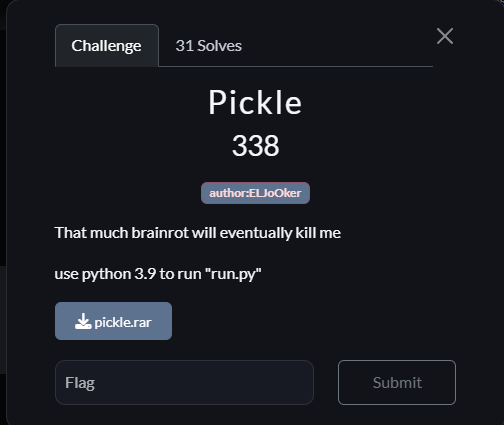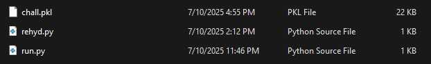 Players are provided with 3 files, 2 python helpers to run the pkl file, and 1 chall.pkl which holds the actual code
