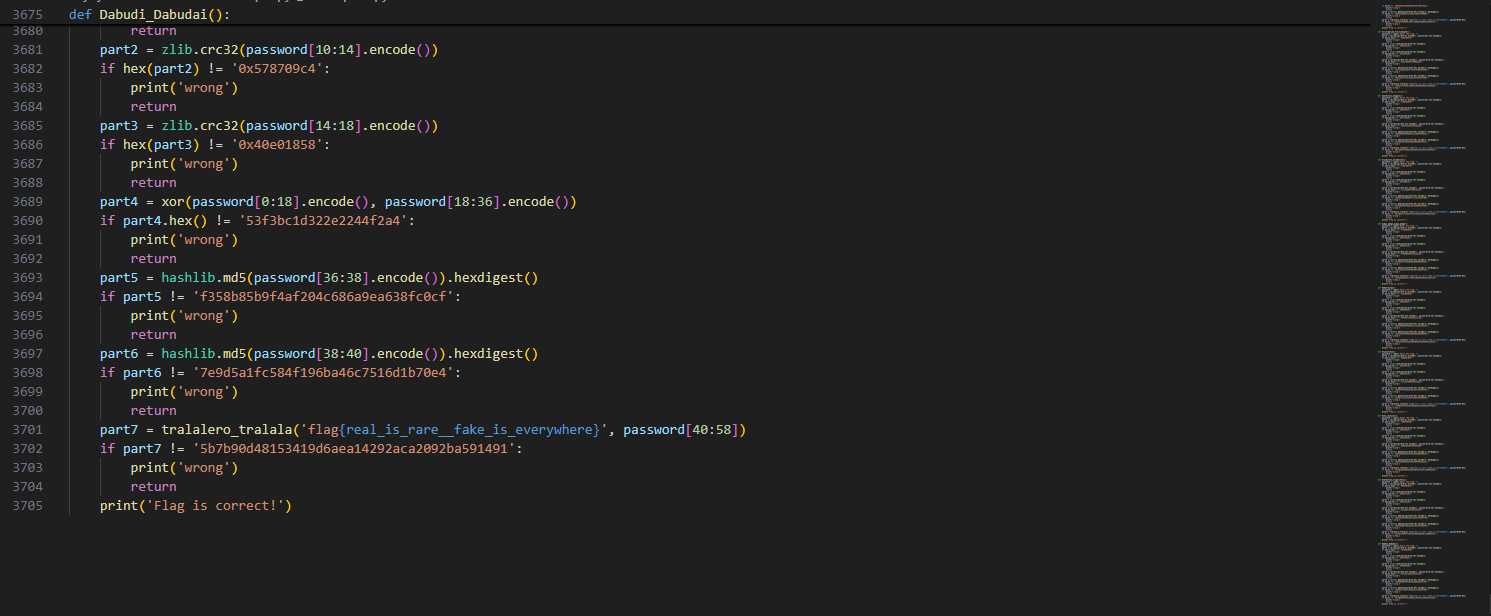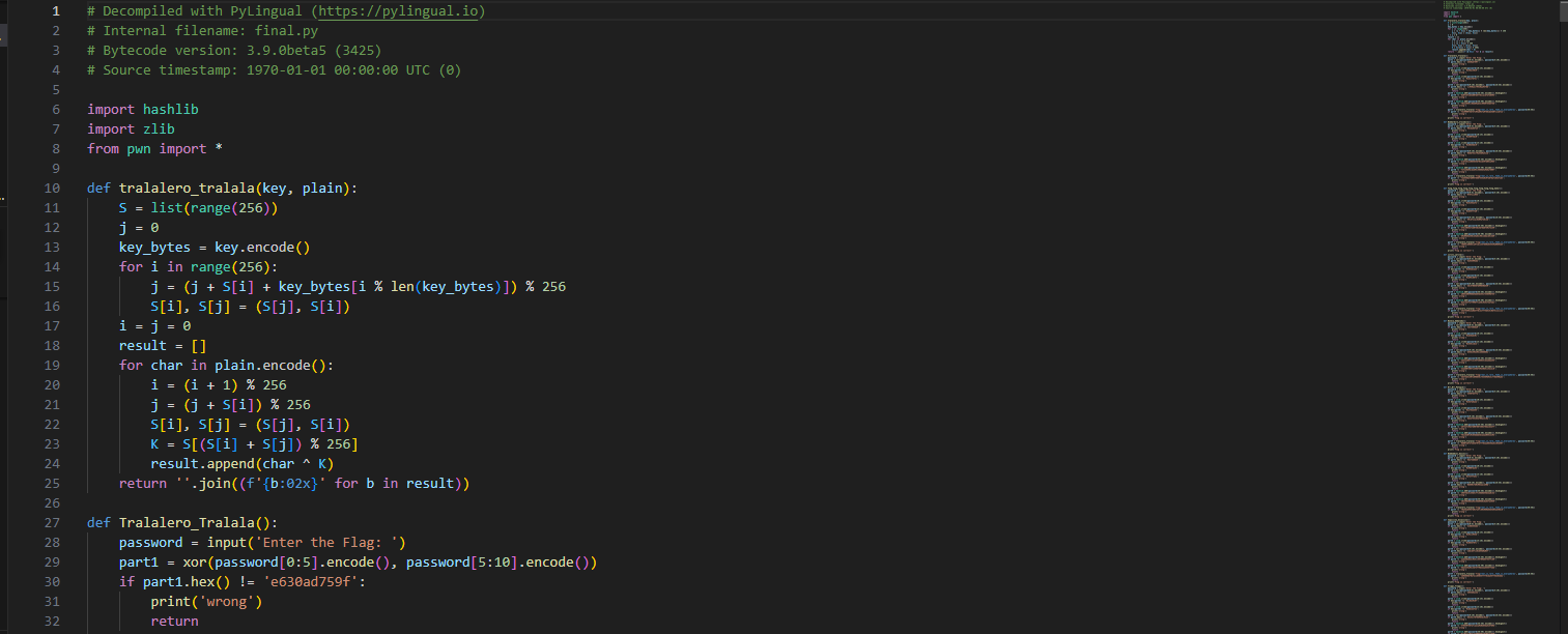 After decompiling the pyc file (I used pylingual for decomplication), it’s a very large source code with a lot of functions looks very similar